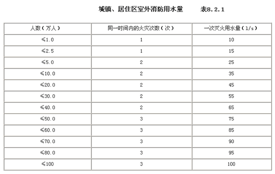 2 关于分区供水消防用水量标准的两种观点 霍州市城市供水工程设计中,关于消防时消防用水量如何确定,省内专家各衷一是,争议源于对国标GBJ16-87《建筑设计防火规范》中第8.2.1条内容的理解不同。该条文原文如下:城镇、居住区室外消防用水量,应按同一时间内的火灾次数和一次灭火用水量确定。同一时间内的火灾次数和一次灭火用水量不应小于表8.2.1的规定。现将表8.2.1转列如下