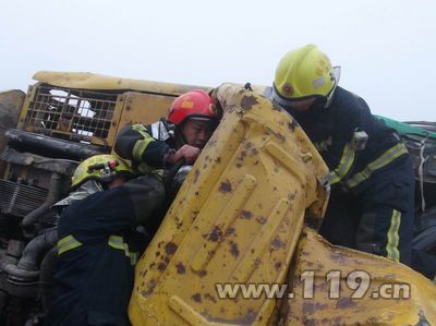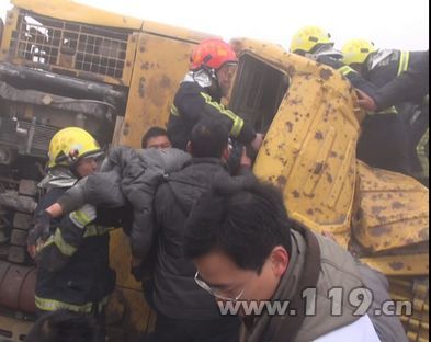 2014年1月5日上午8时11分,杭州富阳新登双联村石矿内,一辆挖掘机翻车,驾驶员被卡在驾驶室内,情况十分危急。接到指挥中心的指令后,富阳消防大队迅速调派抢险救援车和7名官兵赶往事故现场。