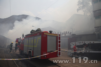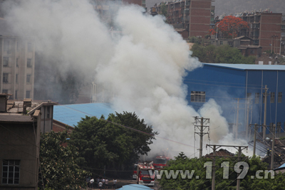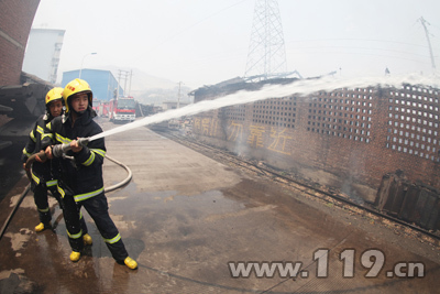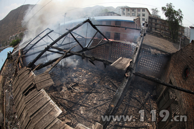 消防官兵到达现场时,一排木质结构的废旧仓库正在迅速燃烧,烟雾四处弥漫。消防官兵立即出5支直流水枪从不同方向控制火势向四周蔓延。由于仓库顶部采用的都是木质构件且上面是一层石绵瓦,给灭火带来一定的难度。中队指挥员根据火场情况,迅速通知矿区工作人员切断电源,并立即出3支直流水枪阻止火势蔓延,按照“先控制,后消灭”的战术原则展开灭火工作。