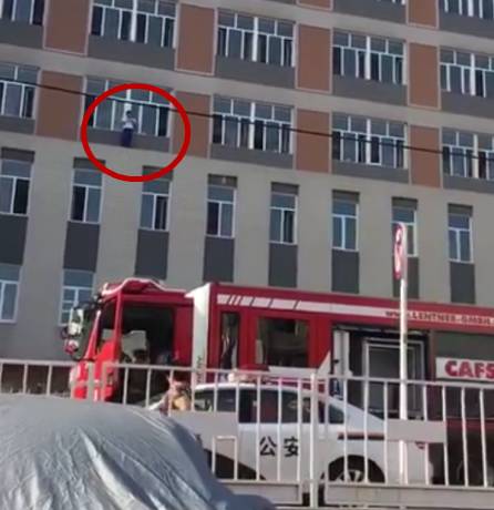 视频中一名身穿校服的学生站在学校4楼的窗外,